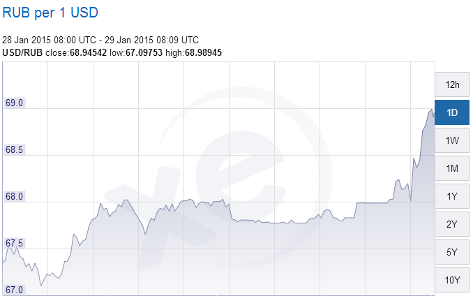 "The volatile ruble has hit a fresh low against the US dollar, trading at 69 per 1 USD after the Russian currency lost 2 percent of its value in opening trading hours in Moscow.